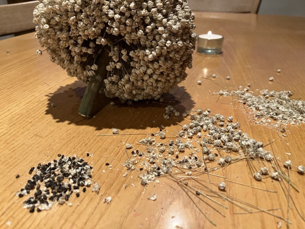 In diesem Fall ist es nicht das Weizenkorn, sondern der Lauchsame… Das Prinzip bleibt das gleiche – die umliegende, verwelkte Pflanzenhülle zersetzt sich nach und nach und der Same, der Kern wird freigelegt. Im vorliegenden Fall wird der Natur vorgegriffen und der Same wird vom Spreu getrennt, damit er im nächsten Jahr wieder gedeihen und der natürliche Zyklus sich fortsetzen kann.